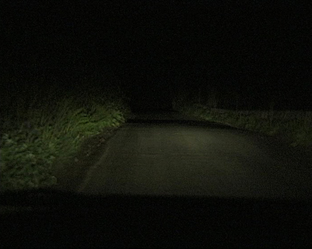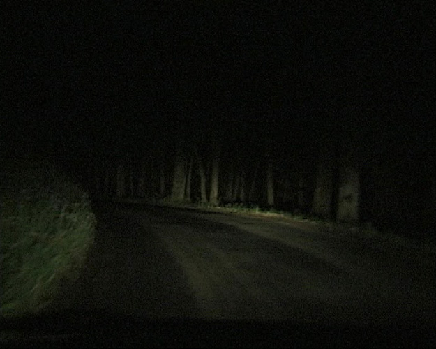 Shot on video driving on a remote unlit country road at night. The car's headlights are turned off at dangerous intervals.