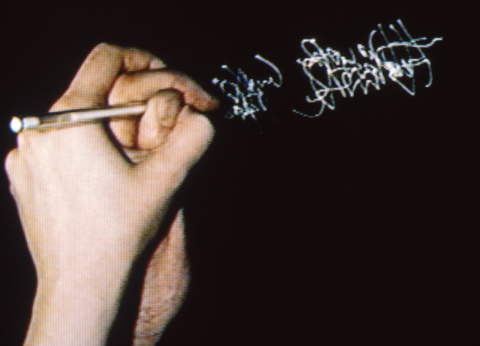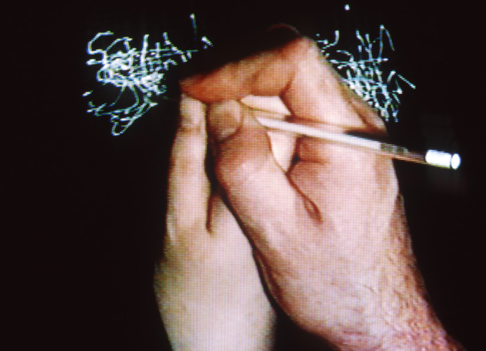 A couple, one left, one right-handed, simultaneously guide each other's non-writing hand to write their name. This becomes a physical struggle.