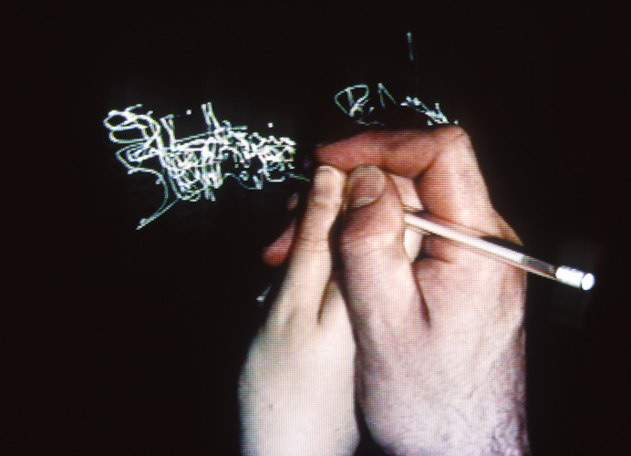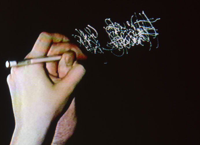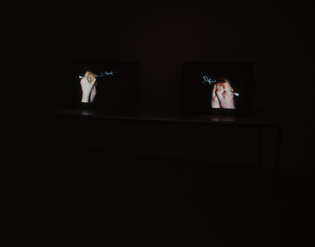 Double colour monitor installation + sound, table. Looped.