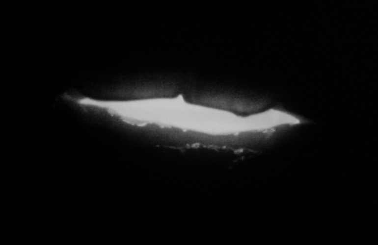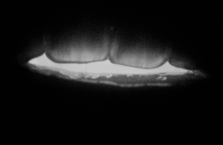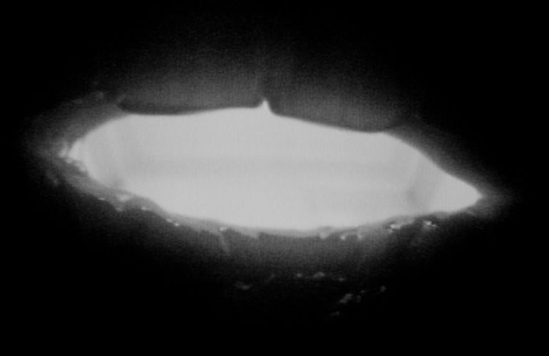 Shot from inside the mouth looking out, attempts to speak are emitted as flashes of light.