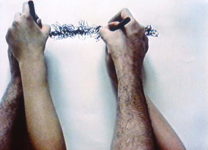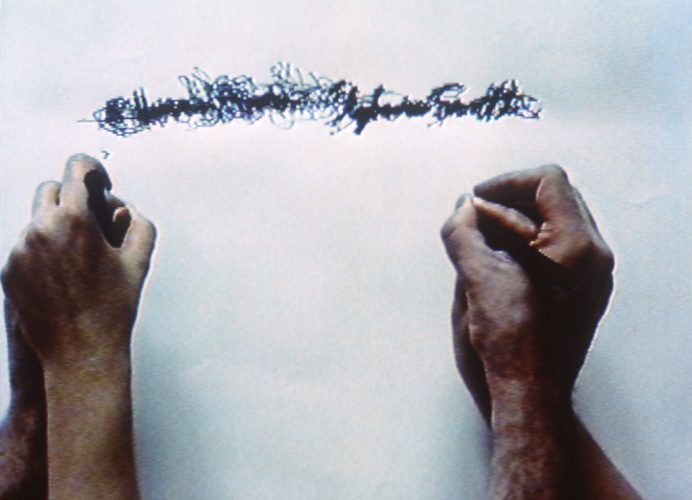 A couple, one left, one right-handed, simultaneously guide each other's non-writing hand to write their name. This becomes a physical struggle.