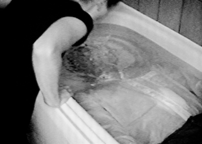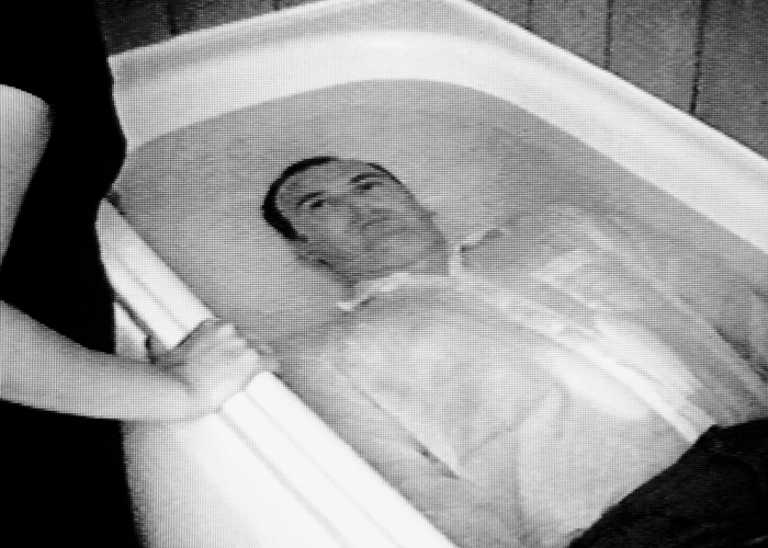 A fully clothed man lies submerged in a bath. A woman leans into the water to give him air every time he breathes out.